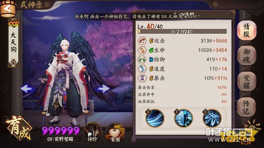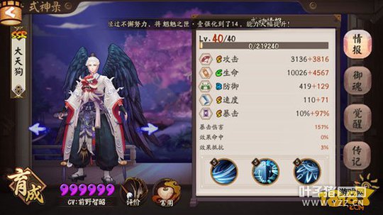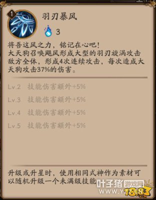3S,1C,1B的面板,不难看出他是一个偏向输出的式神。 为什么要说偏向,等下PVP总结会详细说。 使用方式: 日常,石距等副本:石距完全依靠针女输出,勉强给个3星,带狗粮和鸟姐的效果差不多~很实用~ 秘闻副本:因为自身是AOE伤害,有比较好的控血限能力,极大多数需要AOE伤害的副本大天狗还是非常好用的。 大蛇副本:3个狗子全程挂机,听说过吧~魂10利器噢! 狗子建议打魂10,三个输出里面的一速,卡在晴明后面,不超过128的速度,能吃到星是最好的。