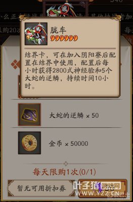 阴阳师曾在早前透露,在即将推出的新副本中有一个名为胧车,相信大家都对胧车十分感兴趣。那么阴阳师胧车到底是什么呢?胧车奖励会给什么?下面小编就来为大家详细介绍阴阳师胧车,一起来看看吧。 阴阳师胧车 阴阳师胧车将会是未来推出的新副本之一,关于副本的内容官方暂时还未透露太多。 而胧车的奖励则很有可能是今天游戏更新后新增的结界卡。 胧车结界卡给的奖励除了常规的经验外就只有5个大蛇的逆鳞,要靠结界卡凑齐50个逆鳞则需要10个6星胧车结界卡,性价比并不高,暂时还是建议将它作为合成变异结界卡的素材使用。 除了胧车副本外,胧车结界卡可以通过购买阴阳师礼包炎炎夏日礼贰获得,礼包售价为30魂玉,每天限购一次。 以上就是阴阳师胧车目前的所有情报,后续更新我们会第一时间报导,请密切关注叶子猪阴阳师专区。