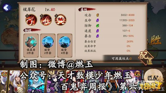 环境分析 1. 欢迎回到百鬼斗花,这周彻底没有克制彼岸花的东西了, 请围绕彼岸花构筑阵容 2. 如果有的话,大概只有镜姬了,毕竟本周只有一个奶:童女 3. 三尾狐依然是一速122,二速119是青行灯和跳跳哥哥,三速118青坊主,四速117古笼火,五速116金鱼姬、兔丸 4. 本周没有打火式神,却有青行灯依然热门,以津真天等无火输出不知能否扛起输出大旗,毕竟彼岸花也是无火输出 5. 有能力秒杀彼岸花的式神,只有茨木,但是茨木行动缓慢所以可能都没有伸爪的机会…… 6. 本周有拉条式神:山兔、兔丸,不过山兔速度只有115,效果见仁见智;兔丸太看脸,不建议带 7. 本周出现控制式神:古笼火,高速沉默,还可以配合酒吞和以津真天,甚至彼岸花 8. 书翁理论上可以部分克制彼岸花,但是基础速度太慢,还没行动可能就被控制了。 9. 本周出现解控式神雨女,但是雨女不能针对彼岸花,效果远不如青坊主。 10. 本周出现金鱼姬,现已加入四保一彼岸花豪华套餐。 推荐式神 T1 与彼岸花并肩作战 彼岸花、青行灯、金鱼姬、童女、山兔、青坊主 T2 有时可以发挥奇效 三尾狐、茨木、雨女、跳跳哥哥、古笼火 T3 偶尔打出配合 两面佛、以津真天、书翁 推荐阵容 一速 灯姐 魅妖/招财 二速 古笼火 招财/木魅 三速 金鱼姬/山兔 火灵 四速 童女 蚌精 五速 晴明 星 六速 彼岸花 破势 阵容解析 这套阵容的主要思路是: 1. 青行灯:控制、熄火 2. 古笼火:给己方彼岸花增伤,或补控(尤其控制书翁) 3. 金鱼姬:帮助全队,针对茨木、妖刀等单体输出 山兔:全队拉条,让友方先行动,避免雨女驱散 4. 童女:帮助彼岸花回血、蚌精格挡控制 5. 晴明星/神乐狐狸增伤 5. 让自己的彼岸花先行动、残血获得5层花海,直接秒掉对手彼岸花。 注:注意让敌方破势彼岸花血量保持在75%以上,否则无法自动秒杀 推荐配置 1-1. 魅妖青行灯