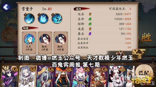 2. 鸣屋配合雪童子的第二轮控制 因为玉藻前的单体技能与破势冲突——敌人生命高于80%,伤害降低15% 于是尝试配合雪童子的控制,用鸣屋直接秒杀敌人脆皮、打出爆炸伤害 雪童子速度241,玉藻前速度如果低于120就可以在雪童子第二次行动后攻击 鸣屋也不会受到敌人血量的局限 减少暴击次数,以防触发百目鬼的凝视