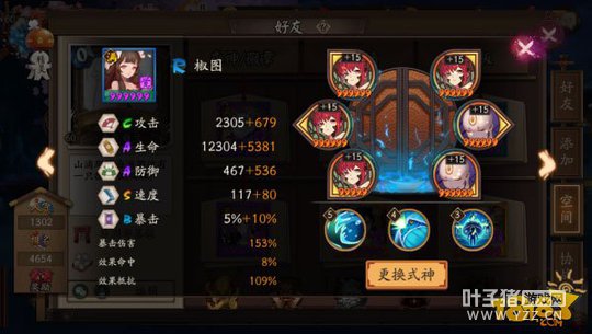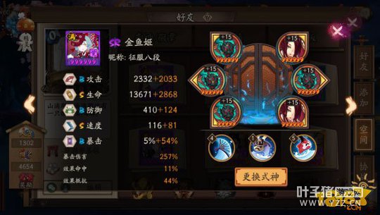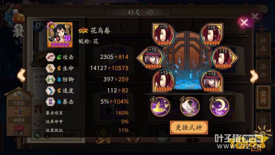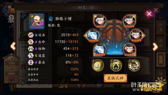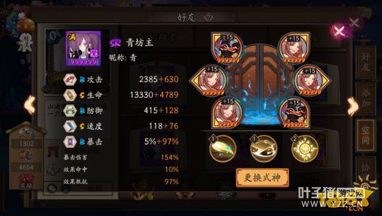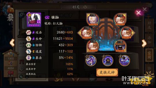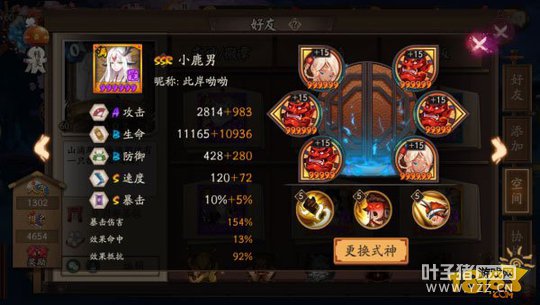 二速度四抵抗六暴击,大招对召唤物伤害不明,上图中的属性一发破盾1.3W伤害。带镜姬一直用来碰瓷犬神、犬神和输出花,配上八百比丘尼反伤占卜可一波带走对面反击输出,在遇到多控队时带木魅更佳。可独自应付低命中般若及其他组合控制,对面几发技能下来点满被动光环,全场附加90抵抗足够对面怀疑人生了。高强度的般若,则需要花鸟雨女青坊主联防,雨女驱散被封印的青坊主,再尽快叠起光环。光环对控制花的克制较为明显,拉锯战中会使花的魅妖/反枕几近失效,保护不堆或低抵抗的花鸟顺利放出大招继续消耗。 小鹿男: