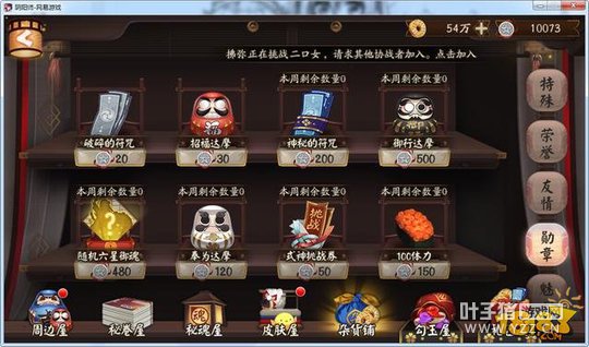 每周一商店刷新,杂货铺勋章和荣誉可以购买两张神秘的符咒。 2、式神绘卷分享