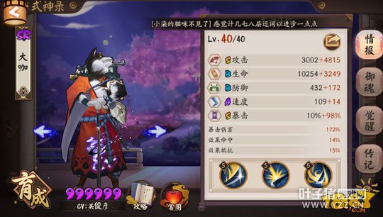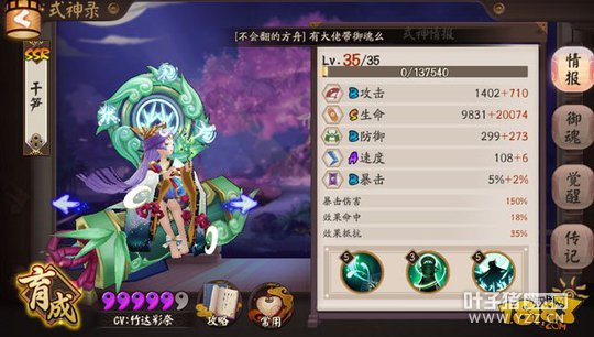 主要是让式神速度多了13点,先手更稳定,讲究快意恩仇,速战速决的宗旨,分享下阵容的配置和对战小心得: 式神配置: