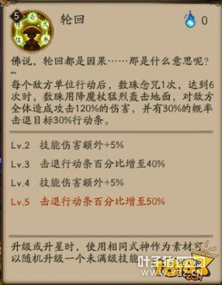 被动,近似于金鱼姬家的小金鱼的被动,不过对面反击无法触发,这个测试我是在天狗四层进行的。注:反击包括狰,犬神万年竹的技能。 这个反击能触发招财猫,多动,鲤鱼旗都触发。但是被冰冻睡眠眩晕后这被动就停下来了。 这个被动的效果还是很不错的,满级后推群体30%概率50行动条,平均每次发动推1.8个人50行动条,作为r卡被动无话可说了。 被动的基础倍率还算不错,但数珠攻击为c,基本上可以忽略这个伤害值了。顺便一提,上一个式神百目鬼和数珠有着类似的被动机制。