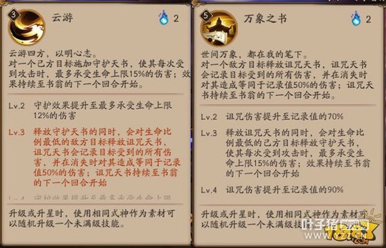 书翁的要求:五星满级,2技能升到3级,3技能也升到3级。 因为保护+诅咒,既可以保护我方式神,也可以记录伤害,对御灵造成高额伤害。满级万象能诅咒两个,群体相当于翻4倍,单体翻3倍~