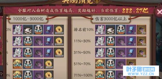 我们需要尽可能调整自己的阵容和御魂搭配,然后在上面两个副本中取得尽可能高的伤害。就第一天的情况来看,想要进入前10%,深情厚谊至少是需要350万的伤害(不同区服可能不太一样)。除了这个排名奖励,我们还可以拿到包括皮肤券头像框这些累计伤害奖励,说白了就是要肝,不过肝度并不是太大,一般玩家两三天就可以完成。