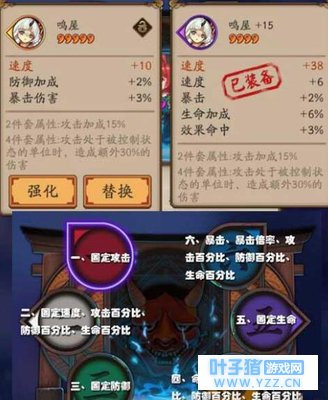御魂,可以毫不客气地说,是这个游戏的根本(所以你知道隔壁山寨为毛叫御魂师了吧(滑稽)),你的御魂好坏完全决定了你的式神的发挥。一套合理的御魂选择可以把一个冷板凳式神送上神坛,一套不合适的御魂也很可能让你优秀的式神毫无用武之地。 单个御魂的主属性取决于他的位置,副属性则是完全随机,副属性有1-4条不等,最多4条,当御魂等级达到+3,6,9,12,15的时候就会随机增加一条副属性或者对已有的副属性进行强化: 1号位(左上角):固定攻击力加成 2号位(左侧):固定速度加成,百分比防御加成,百分比攻击力加成,百分比生命加成, 3号位(左下角):固定防御值加成 4号位(右下角):百分比效果命中加成,百分比效果抵抗加成,百分比攻击力加成,百分比生命加成,百分比防御加成 5号位(右侧):固定生命值加成 6号位(右上角):百分比暴击几率加成,百分比暴击伤害加成,百分比攻击力加成,百分比生命加成,百分比防御加成 对于一个新手,我给出一个关于御魂最稳当的发展路线: 1、1-35级左右:升级,御魂可以随意选择,不需要太过纠结,在此阶段你应该以升级为第一目的,斗技可以随便玩玩但不要太过较真(一般你都会遇到比你高10级以上的人- -,然后发现被神乐或者晴明的反伤反死……) 2、35-50级左右:你必须开始认真对待你的御魂,在此阶段你的第一目标应该是打过魂10(下面我会介绍大家熟知的舞法天团)然后通过石距来获取御魂(因为你并不具备组队10层的能力,而此时石距的产出却是根据魂10的水准。重复刷石距直到有一天你能稳开魂10的车为止。 3、刷魂10刷魂10刷魂10刷魂10刷魂10刷魂10刷魂10刷魂10刷副本刷副本刷副本刷副本刷副本刷副本刷副本当然还有氪金…………直到你成为一个大佬。