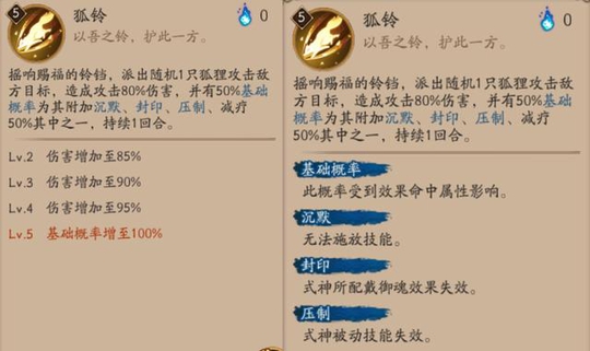 一技能:狐铃 效果:派出随机1只狐狸攻击敌方目标,造成攻击80%伤害,并有50%基础概率为其附加沉默、封印、压制、减疗50%其中之一,持续一回合 解读:普攻附带额外属性的,我看着像SSR猫掌柜的设定,不过这个比较看脸,脸好没准中的是压制和封印,脸不好减疗就打出来了,从这个技能设定就能看出来,御馔津的普攻自带这些debuff的。