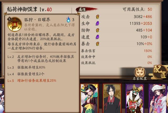 二技能:狐狩日曜界 效果:创造存在1回合的日曜界,此期间,友方全体提升20点速度,20%效果抵抗。 每当友方回合结束后,使行动条最前端的另一友方增加20%行动条。 lv.2友方增加行动条时,40%概率驱散其带有的1个减益状态或控制效果 lv.3驱散概率增至80% lv.4驱散数量增至2个 lv.5增加行动条效果增至25% 解读:开结界提高效果抵抗同时拉条,技能提高后还附带了额外的驱散效果,其实这技能...跟数珠一样嘛,不过在拉条能力上更加繁琐一些,其实和数珠被动的推条大同小异。