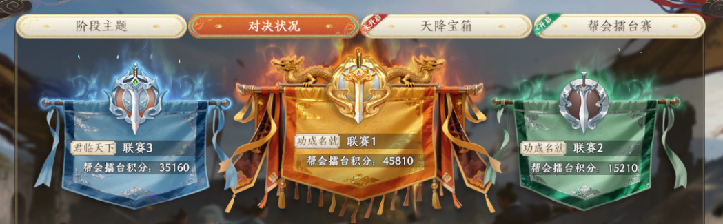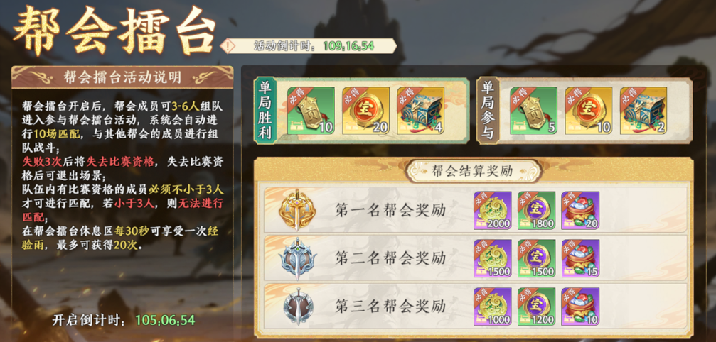 全新玩法 帮会竞赛 金戈铁马,枕戈待旦;纵马扬鞭,共战九霄!在这方热血的武侠世界中,天龙2即将迎来全新资料片,今日就快随小编一同提前揭开全新重磅玩法——“帮会竞赛”的神秘面纱吧! 匹配说明 匹配条件:进入S2赛季的所有服务器,人数大于20人,并且活跃度大于30的帮会,有资格参与匹配。 匹配规则:按照帮会当前战力和历史胜负记录修正分数进行匹配,每3个帮会匹配到一起进行帮会竞赛,若剩余帮会数量不足3个,则会两帮匹配。 阶段说明 天降宝箱 天降宝箱一旦开启,对战的三个帮会将会传入同一帮会战境场景。诸位侠士,速以火眼金睛锁定宝箱,或以雷霆手段击退强敌,方能掌控战局先机!快速拾取宝箱或击杀其他玩家即可获得宝贵的积分和奖励。 帮会擂台 帮会擂台开启后,帮会成员可3-6人组队进入参与帮会擂台活动,系统会自动进行10场匹配,与其他帮会成员进行组队战斗。 玩家失败3次后将失去比赛资格,失去资格后可退出场景。 队伍内有比赛资格的成员必须不小于3人才可进行匹配,若小于3人则无法进行匹配。 在帮会擂台休息区每30秒可享受一次经验雨,最多可获得20次。 积分及奖励说明 帮会竞赛采取个人、帮会双积分制,竞赛不仅考验个人武艺,更强调帮会成员间的协作与战术布局。 个人:每个阶段完成相应活动,可获得个人竞技积分,每个阶段可获得丰厚的个人奖励。 帮会:每个阶段帮会积分为个人积分之和,帮会会按照帮会积分排名获得排名奖励。 各位侠士,战鼓已擂,烽烟将起,望速速集结,力鼎帮派荣辱。邀君并肩战敌,扬我帮派威名! |