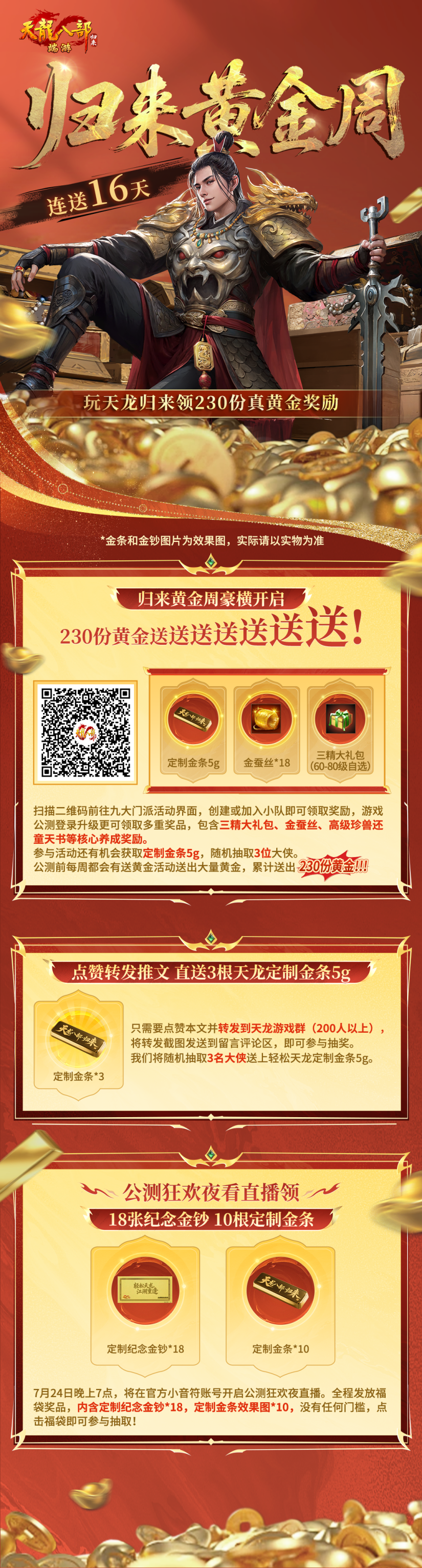 公测倒计时15天! 为迎万千侠士豪情归来,轻松天龙倾尽诚意,继续送黄金,后续累计将送出230份黄金!并且推出九大门派集结活动,再送福利! 【福利提示】 扫描下方二维码参与九大门派集结活动,领游戏豪礼,抽定制金条! 归来黄金周 每天都能领黄金 这一次,我们送上 实实在在的黄金,和数量丰厚的核心游戏道具 致敬每一位并肩作战过的老玩家! (注:点赞转发推文抽黄金 活动,请前往 天龙八部·归来 官方微信公众号参与) 温馨提示 公测前每周我们都将会举办送黄金福利活动,截止到公测,累计将会送出230份黄金!同时所有黄金活动0门槛参与,人人都有机会拿,只为回馈所有天龙老玩家! 活动攻略懒人版 不想仔细看活动规则小懒猫大侠看这里,我们帮你总结了活动要点! 温馨提示: 门派集结抽黄金 和 点赞转发推文抽黄金 ,两个活动各送3根定制金条5g,共6根,大侠都可以参与哦! 其中 点赞转发推文抽黄金 活动,请前往 天龙八部·归来 官方微信公众号参与活动。 |