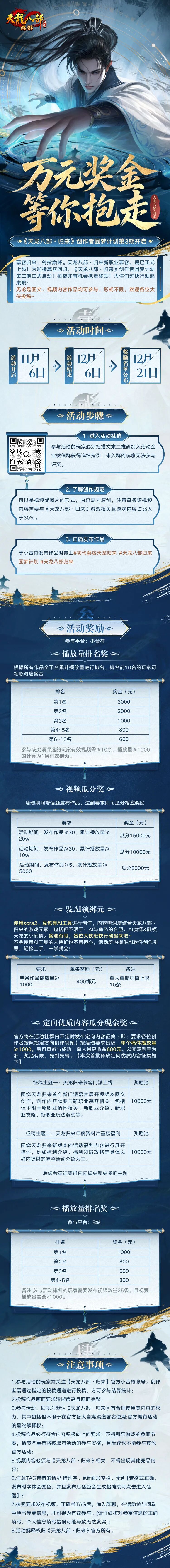 慕容归来,剑指巅峰!为迎接新职业【慕容】重磅登场,天龙归来创作者圆梦计划第三期正式启动! 你的才华,我们用真金白银来买单!本次活动全面升级,人人有奖,轻松参与! 活动累计将送出十余万元奖金和海量绑元!大侠只要参与,就能轻松抱走奖励,图文、视频内容均可,形式不限,轻松拿福利! 龙妹前排提示: 只要参与投稿,满足入门播放量(简单,易达成),即可轻松领取最高4000绑元。此外还有累积10余万元的奖金池等你来瓜分,并且两个平台活动可同时参与,奖励不冲突哦!需满足各自平台对应的活动规则即可。 重要信息提示 活动说明 欢迎大侠前往小音符、B站投稿,无论是图文、视频内容均可,形式不限 活动时间 活动开启:11月6日 活动结束:12月6日 奖励名单公示:12月21日 参与方式 1.进入活动社群:参与活动的玩家需要扫描上方长图中的二维码加入活动群,获得详细指引,未入群的玩家无法参与评奖。 2.了解创作规范:可以是视频或图片的形式,内容需为原创,注意每条短视频内容需要与《天龙八部·归来》游戏相关。 3.正确发布作品:发布作品时需带话题/标签,内容可以结合多个创作方向。 小音符话题:#初代慕容天龙归来??#天龙八部归来圆梦计划?#天龙八部归来 B站标签:#初代慕容天龙归来??#天龙八部归来圆梦计划?#天龙八部归来 十万现金,海量绑元,投稿即有机会抱走奖励!大侠们赶快行动起来吧~ |
