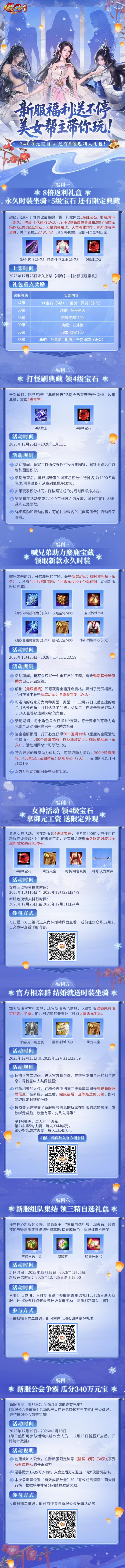 轻松情怀端游《天龙八部·归来》备受瞩目的12.25超级返利红颜新服命名投票终于落下帷幕,万众期待的服务器名称今日正式揭晓! 惊喜远不止于此,我们给大家请来了美女帮主天团强势入驻,更备下了诚意满满的年末超级福利,4级宝石、永久时装、称号,限定款坐骑、天马,还有归来定制金条,这一波福利必须拉满! 天龙归来首个两字服务器 各位大侠对12月25日超级返利红颜新服命名投票热情高涨,现在就为大家正式揭晓投票与命名结果—— “洛神” 以得票占比30%位列第一,也将成为天龙归来首个以2个字命名的服务器,感谢各位大侠的积极参与! 详细开服信息如下: 女神帮主强势入驻 江湖有铁血,亦有柔情!本次红颜新服,我们特邀多位颜值与实力并存的美女帮主强势入驻。 她们将亲自创建帮会,招贤纳士,无论你是想寻找并肩作战的红颜知己,还是想在美女指挥下激情帮战,这里都有你的位置! 女神帮主的帮会名单 图片仅展示部分美女帮主的帮会信息,还有更多美女帮主入驻中,敬请关注! 女神直播七天乐 爆照第二弹 12月22日、12月25日-12月30日,女神直播七天乐狂欢开启! 今天为大家带来的是顶流女神达人 @小溪 的美照! 每天一位人气女神接力入驻新服,实况直播,与你并肩作战! 从野外激战到硬核副本,更有花式整活名场面预定!诚邀全服玩家共同前来狙击围观,一战成名! 新服专属福利一览 12月25日超级返利红颜新服上线,我们为大家带来多重福利: 参与女神活动,在12.25新服领4级宝石,拿绑元工资,还送限定永久时装、全属性加20的永久称号; 进官方相亲群,结婚就送时装坐骑,还有绑元奖励; 还有刷典藏领4级宝石、新服公会争霸瓜分340万元宝、新服组队领三精自选礼盒、兄弟助力解锁麋鹿宝藏,领永久时装,以及8倍返利礼盒等等福利活动 福利详情已汇总在下图中,各位大侠可点击查看: 江湖路远,幸有红颜相伴,亦有兄弟同行。 战鼓已经擂响,福利已经备好,只待大侠仗剑而来。 快快呼朋唤友,锁定新服,让我们在全新的江湖里,醉卧美人膝,醒掌天下权! |