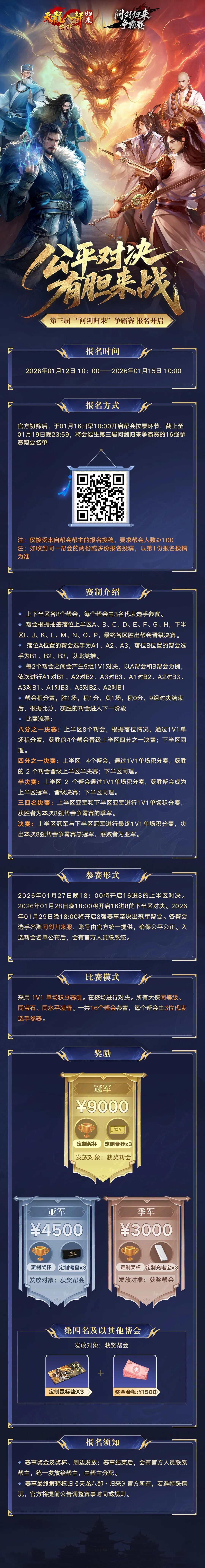 公平对决,有胆来战! 第三届“问剑归来”争霸赛,报名、选拔和赛制全面革新,公平性拉满! 以帮会为单位报名,参赛选手由帮会自己说了算! 并且这一次,我们依然将秉持大赛的传统:拒绝数值碾压,拒绝装备压制,全凭操作定胜负! 赛事奖励较上届大幅升级,直接翻三倍!万元奖金、定制奖品、精美周边已备好,只待强者入局! 赛制革新 帮会报名 公平再进一步 为了让每一场对决都更加惊心动魄,第三届比赛在规则上迎来了重大升级:由个人的实力,上升到帮会间的较量! 三人协力,铸就帮会荣耀! 本届比赛将以“帮会”为单位出战。每个参赛帮会需派出3位顶尖高手作为代表,肩负全帮兄弟的荣耀,踏上征程! 1V1车轮积分赛 九局定胜负 告别一局定胜负的偶然性,我们将采用9组 1V1 循环对决模式! 假设A帮会(选手A1/A2/A3)对阵 B帮会(选手B1/B2/B3),双方将进行如下对战: 第一轮:A1 vs B1,A2 vs B2,A3 vs B3 第二轮:A1 vs B2,A2 vs B3,A3 vs B1 第三轮:A1 vs B3,A3 vs B2,A2 vs B1 胜一场积1分,败一场积0分。 9场鏖战之后,总积分高者晋级! 不仅考验个人操作,更考验排兵布阵的策略! 官方统一账号,绝对公平 所有比赛将在【问剑归来服】进行,账号由官方统一提供。 全员同一起跑线,全凭操作定胜负! 在这里,只有硬实力! 赛制详解:8强帮会争霸赛 除了赛制的革新,本届比赛还制定了严谨的分区落位与晋级规则。 从票选16强帮会到总冠军,每一场都是生死之战! 上下半区落位: 入选的16个帮会将通过抽签分为上半区和下半区,每区各8个帮会。 上半区:?A、B、C、D、E、F、G、H 下半区:?I、J、K、L、M、N、O、P 每2个帮会之间会产生9组1V1对决。 胜1场,积1分,负1场,积0分,9组对决结束后,根据比分,获胜的帮会进入下一阶段。 赛事流程 比赛将分为五个阶段,层层淘汰。 八分之一决赛:上下半区各8个帮会进行对决,决出8个获胜帮会(上下半区各4个)晋级下一轮。 四分之一决赛:上半区4个帮会捉对厮杀,决出2个晋级名额;下半区同理。 半决赛:上半区最终胜者成为上半区冠军,晋级总决赛;下半区决出下半区冠军。 季军争夺战:上半区亚军 vs 下半区亚军,胜者为本届季军。 总决赛:上半区冠军 vs 下半区冠军,进行巅峰对决,胜者加冕第三届“问剑归来”总冠军! 赛事时间预览 本次大赛将集结16支最强帮会,分为上下半区,通过残酷的淘汰赛决出武林至尊! 16进8(上半区):2026年01月27日 18:00开赛 16进8(下半区):2026年01月28日 18:00开赛 8强至总决赛:2026年01月29日 18:00开赛 从八分之一决赛到总冠军争夺,三天连战,热血不断! 赛事奖励翻三倍 功成名就在今朝 为了表彰各个帮会中的顶尖高手,我们准备了相较于上届赛事三倍的丰厚奖品: 报名现已开启 各位大侠,是时候展现帮会的统治力了,快快报名参赛吧! 报名时间 即日起—2026年01月15日10:00 报名要求 1、仅接受帮会帮主代表本帮会报名,会根据问卷信息核实帮主身份。 2、报名的帮会人数需 ≥100人。 3、若同一帮会提交多份报名,以第1份为准。 报名方式 扫描下方图中二维码,即可参与报名 龙妹温馨提示: 报名结束后,官方将进行初筛。 1月16日10:00—1月19日23:59将开启帮会拉票环节,最终票选出16强参赛帮会! 报名须知 1、赛事奖金及奖杯、周边发放:赛事结束后,会有官方人员联系帮主,统一发放给帮主,由帮主分配。 2、赛事最终解释权归《天龙八部·归来》官方所有,若遇特殊情况,官方将提前公告调整赛事时间或规则。 公平对决,有胆来战!最终哪个帮会问鼎冠军,哪位选手操作封神? 第三届问剑归来争霸赛,期待你的参与和见证! |
