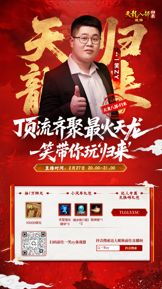 各位大侠,初七大吉!初七人日,万物复苏 想必诸位已经调整好状态,准备在新的一年大展宏图! 在此,龙妹祝愿大家:步步高升,欧气常伴! 当然,新春福利自然少不了,今日份新春专属礼包码来咯~~ 今日礼包码:JMYC2026 礼包码兑换有效期:3月31日晚上23:59 愿这份薄礼,能助大侠在江湖中更进一步,马到成功! 旭旭宝宝传媒深度合作 一笑zy入驻开年新服2026 江湖风云起,各路豪杰聚。继昨日的惊喜之后,今天龙妹又要宣布一条重磅新闻! 天龙归来与旭旭宝宝传媒联动,旗下知名主播【一笑zy】将入驻归来和大侠共游江湖! 他,是旭旭宝宝传媒的人气主播、实力担当,熟悉一笑的玩家都知道,他在2017年中国游戏主播热度榜中跻身前列。但在“顶流主播”这个身份背后,他还有一个隐藏了十几年的身份—— 一位十多年的资深天龙老玩家。 从《天龙八部》经典服到怀旧服,一笑zy见证了天龙江湖十余年的风风雨雨。 那些年,他曾在野外被人追杀到怀疑人生,也曾带着兄弟们横扫一方;他曾为了一颗宝石精打细算,也曾在深夜盯着装备强化界面,期待那一道金光闪过。 然而,和无数老玩家一样,直播事业的忙碌、生活节奏的加快,让他不得不暂别这片江湖。 如今,天龙归来这篇轻松的新天地,简化了养成、日常又轻松,福利还拉满,一笑表示:我带兄弟们冲! 他带头冲锋,正式入驻开年最火新服【2026】,与所有大侠并肩作战! 想看他直播“搓装备”?想看“生宝宝”现场翻车?想看宝石三合一到底能成几个? 没问题,全都安排! 2月27日 20:00 - 21:00,他将和归来官号连麦,为大家带来一场真正的“天龙老玩家回归秀” 搓装备、生宝宝、宝石三合一,激情PK,帮派打架,海量专属福利等你来拿! |
