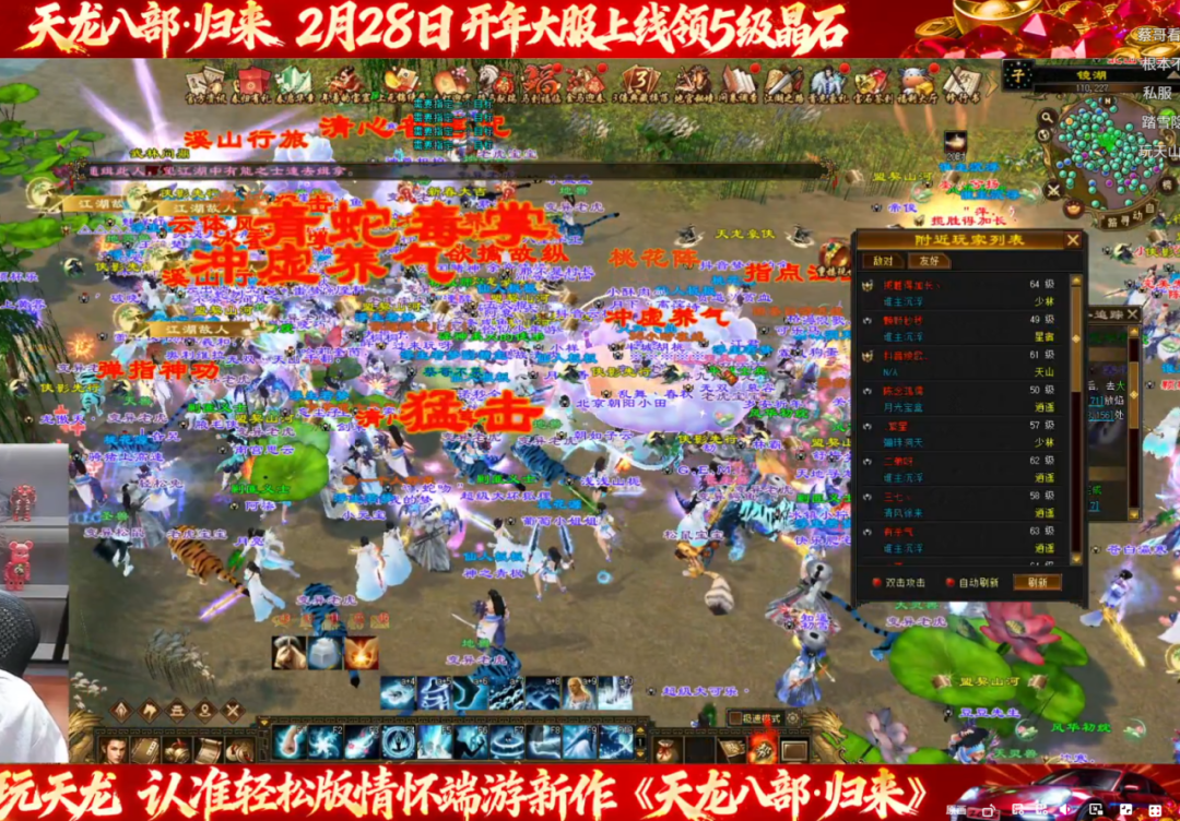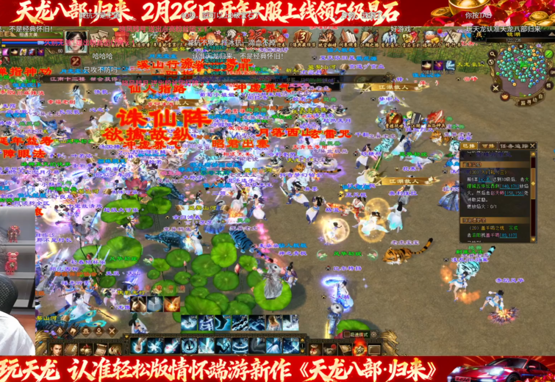 最近龙妹看到不少大侠的留言,说春节期间忙着走亲访友,错过了游戏里的各种奖励,感觉亏了一个亿! 别担心,春节福利找回活动,它来了! 现在只需每天花10分钟搞定100点活跃度,就能直接补领1天的春节奖励。 哪怕整个春节期间1天都没有登录,只要在找回活动中保持活跃,依然能把春节核心奖励完整抱回家! 5级晶石、永久属性称号、2200绑定元宝,还有保底23颗2级红宝石,轻松一键找回! 春节福利找回活动现已开启 活动时间: 3月2日 — 3月24日 24:00 活动规则: 春节期间未完整领取游戏内“骏马献瑞”、“福运摇金”和“新春好礼”活动基础奖励的玩家,可通过达成等级和每日活跃条件,可在页面进行基础奖励查询和找回。 参与条件: 除2月28日新服外,其他正式服玩家均可参与。(新服已复开春节活动,可直接参与领取) 需账号达到68级,3月2日至3月24日期间,每日领取游戏内100活跃度宝箱 可找回内容一览: 1、骏马献瑞 2月5日-2月24日期间未领取的【骐骥宝箱】,找回上限20个。 注:2月25日-2月28日未领取的暂不支持找回。 骐骥宝箱:打开必得自选晶石碎片礼包(5级)*3,可随机获得珍兽技能书礼包*1、天罡强化精华*2、天罡强化精华*1、金蚕丝*2、金蚕丝*1其中之一,更有机会获得红宝石(6级)*1和坐骑:大风*1。 2、福运摇金 2月5日-2月26日期间未领取的【绑元宝箱】和【神骏佑天龙碎片】*1,找回上限22个。 注:2月27日-3月3日未领取的暂不支持找回。 绑元宝箱:打开可随机获得绑定元宝票*500、绑定元宝票*400、绑定元宝票*300、绑定元宝票*200、绑定元宝票*100其中之一。 3、新春好礼 2月6日-2月28日期间未领取的【日活礼包】,找回上限23个 日活礼包:可随机获得红宝石(5级)*1、红宝石(4级)*1、红宝石(3级)*1、红宝石(2级)*1其中之一。 【龙妹温馨提示】 1、在页面成功找回后,请前往大理NPC龚彩云处领取奖励 2、游戏内完成活跃和等级任务后,页面数据可能有10分钟左右延迟,请耐心等待刷新 3、活动结束后未领取的奖励不予补发,请务必在3月24日前完成找回 5.9级号暴力打造 镜湖百人混战杀疯了! 昨晚浮夸刚在开年大服【2026】豪横打造5级号,喊话MMO大军集结,今晚他直接整了个更大的活,打造更进一步,直接上5.9级号!(属性宝石+体力宝石)浮夸边打造边放话:“5级只是热身,5.9才是起步,谁也别拦我!” 打造完毕,一声令下,号召帮会【浮夸真的要强】的兄弟们前往镜湖,参加“武林问鼎”活动。 好家伙,这一去直接引爆了全服大战——数百人同屏混战,技能特效铺天盖地,场面一度失控! 浮夸冲在最前线,一边输出一边嘶吼:“兄弟们跟我上!让他们看看什么叫真正的帮会凝聚力!”帮会兄弟们也是血性十足,复活立刻反打,硬生生在混战中杀出一条血路。 浮夸边打边感叹:“这才是MMO该有的热血!归来这波减负做得好,让大家有更多时间干架,爽!”直播间观众看得热血沸腾,弹幕狂刷:“浮夸牛逼!”“这人真多,打的过瘾!” 战斗间隙,浮夸还不忘给粉丝送福利,再次强调归来福利多、减负爽,喊话自家粉丝:“还没来的兄弟抓紧了!神秘代码FUKUA666,上号领专属奖励,咱们一起征战归来,拿下全服第一!” 玩天龙,认准《天龙八部·归来》!上号! 精彩不停歇,小柏今晚上线精彩接力 新服的激情还没散去,今晚的狂欢又要加码! 就在今晚,那个曾为天龙创作过无数爆款原创视频、用犀利点评和独特整活风格征服无数玩家的男人——下头男小柏,将再次开播! 开播时间:今晚20:00 - 21:00 想看他今晚是欧皇附体还是非酋跳脚?想听他又爆出什么传世金句?定好闹钟,今晚不见不散! 福利已备好,大神已就位。 各位大侠,赶紧上线做活跃,把属于你的春节福利统统拿回来吧! |