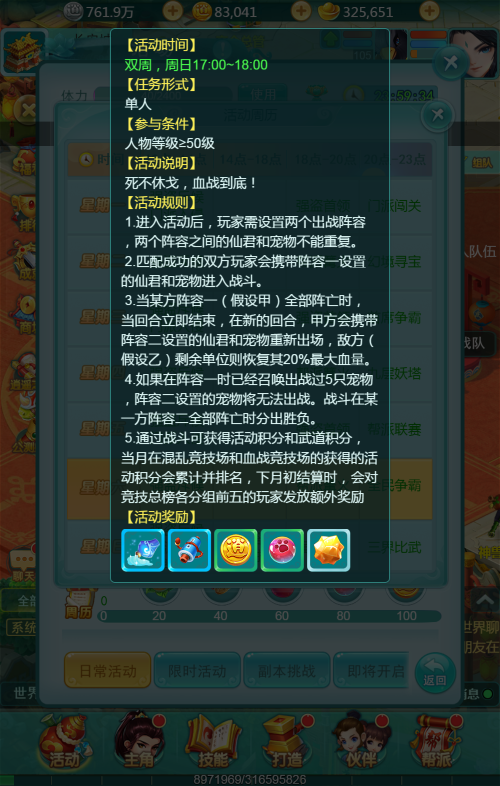 在《逍遥情缘》中,一般的战斗都是一场定胜负的,很少有车轮战这种事,不过也有例外,那就是血战竞技场这个活动。正如活动的名字所说,这个活动里你需要拿出自己所有的底牌,和对手血战到底...这样的比武一定很激烈吧?让我们一起来看看这个活动到底是如何玩的。 【两大阵容 轮番上阵】 血战竞技场于每隔一周的周日17:00—18:00举办,50级以上的少侠就可以报名参与。由于这个活动是单人活动,所以不能与任何人组队,一切都只能依靠你自己,而且你还需要拥有足够多的仙君和宠物,因为这是车轮战,你要有两个队伍才行! 进入活动之后,少侠需要设置两个出战阵容,两个阵容之间的仙君和宠物不可以重复。随后开始匹配,匹配成功的双方少侠会携带第一个阵容进行战斗。当某一方第一个阵容全部阵亡后,该方则会换上第二个阵容重新出场,而另一方的全员会回复20%气血。 【血战到底 胜者为王】 值得一提的是,如果在第一个阵容时已经召唤出战过5只宠物后,第二阵容设置的宠物将无法出战,战斗将会在某一方两个阵容都阵容后分出胜负。通过比武,少侠可以获得活动积分和武道积分,从而在下个月初获得额外的奖励。 所以说,血战竞技场是一场考验少侠仙君和宠物储备,以及阵容搭配的大考验,血战到底的游戏规则也是非常的有趣!《逍遥情缘》手游安卓公测的大门已经敞开,相信这款游戏在未来还会带给我们越来越多的惊喜。 想了解《逍遥情缘》手游更多内容,欢迎关注和留意叶子猪逍遥情缘手游官方合作专区。 |