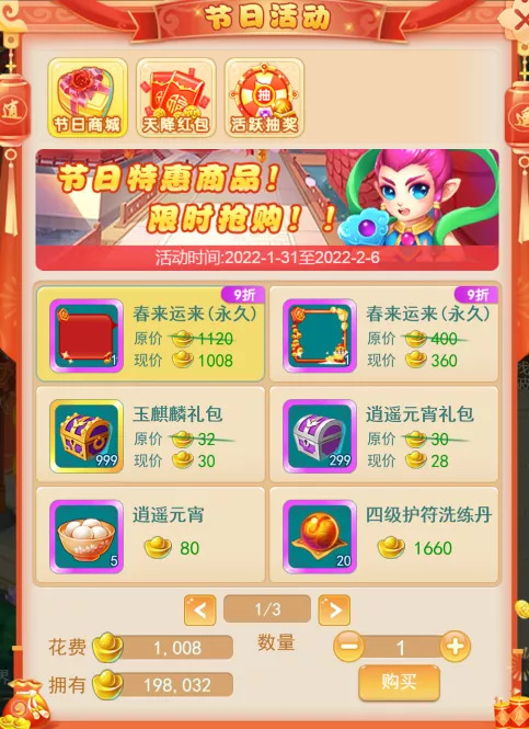 2022年的春节马上就要到了,在这样一个重大的传统佳节里,《逍遥情缘》手游自然也是有许多好东西要献给大家。有一批好货将会上架限时商城,少侠们可以趁此机会淘到便宜又好用的道具和礼包!具体有哪些呢?就由我来给你总结一下吧。 【时装商城 上架好货】 新春佳节到,没有一款聊天气泡和时尚头像框那怎么能行呢?春节期间,限时商城就推出了「春来运来」聊天气泡和头像框。全身一套下来,少侠过年出门的行头就有了!行走在逍遥手游世界,还能收割一大波羡慕的目光,让你直接可以C位出道。 同时,新年还推出了一款三色的「虎虎生威」时装!在1月18日至2月11日期间,少侠可在时装商城购买入手。这套时装推出了多色彩款式,能满足不同少侠们的偏好选择,比如我最钟意的还是红色款,那么少侠你呢? 【豪华礼包 助力新春】 少侠们关心的节日礼包也来了,本次春节将推出两种礼包!第一款玉麒麟礼包,开启后有概率获得重生丹、锻造石,还有额外概率能开出玉麒麟坐骑;第二款逍遥元宵礼包,这份礼包除了能开出重生丹,还有概率获得逍遥元宵,使用后可以增加宠物的1点潜力。 除此之外,商城还上架了许多其他优惠商品,比如护符洗练丹、装备锻造石、桂花羹翡翠汤等等。春节囤年货那是咱们中国人浓重的年味,逍遥手游限时商城首开,少侠,有你需要的物品道具不? 《逍遥情缘》手游安卓公测的大门已经敞开,相信这款游戏在未来还会带给我们越来越多的惊喜。想了解《逍遥情缘》手游更多内容,欢迎关注和留意《逍遥情缘》手游官方微信公众号,我们将第一时间发布关于《逍遥情缘》手游的最新资讯~ |