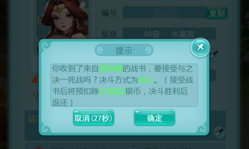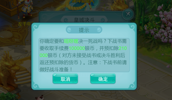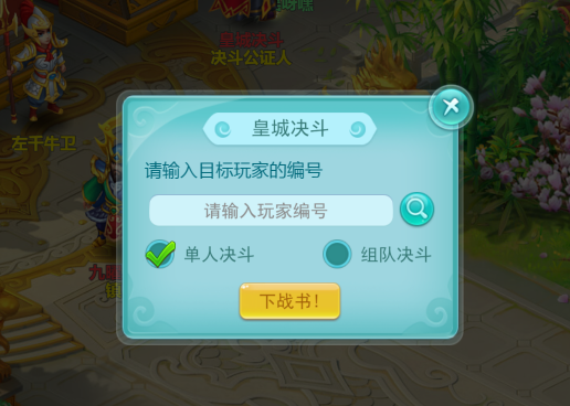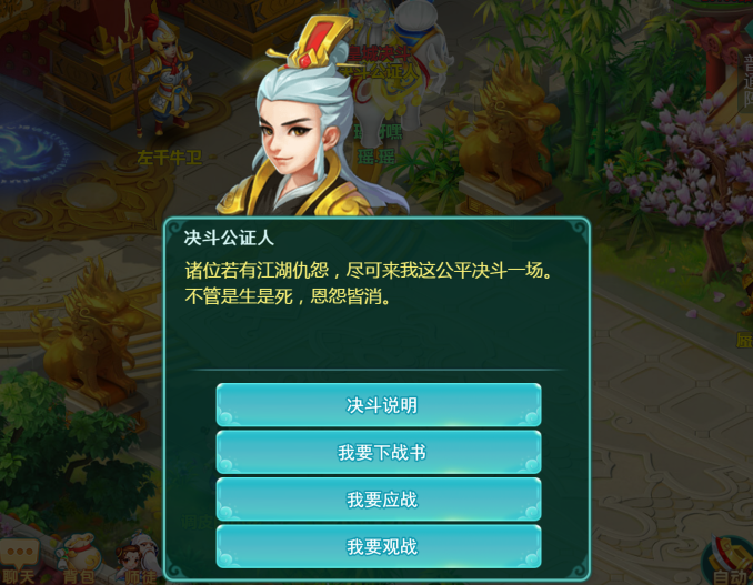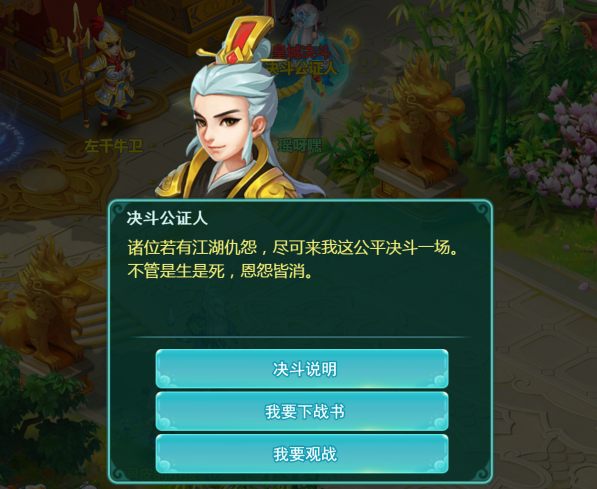 有人的地方就有江湖,而江湖恩怨最好的解决办法就是决斗,谁的拳头硬谁就有道理,这也是江湖中人最佳的解决办法。逍遥情缘手游近期曝光了全新的PK玩法『皇城决斗』,下面让我们一起来了解一下这个玩法究竟是怎么样的。 在逍遥世界这个很讲武德的地方,想要很公平公正地解决矛盾,就必须得有一个“权威”第三方作为见证。 因此我们将在长安城(28,8)位置设立“决斗公证人”,届时少侠只需前往此处,即可展开一场堂堂正正的决斗! 活动介绍 【发起方】: 想要参与决斗很简单,只需在“决斗公证人”处点击“我要下战书”便可进入战书页面; 在“战书页面”少侠需输入决斗对象的编号(玩家个人信息页面可复制); 若只想解决个人恩怨,那勾选“单人决斗”就OK了;若少侠是想打“群架”,勾选“组队决斗”就没错啦~ 这里瑶瑶得多说一句~若选择“组队决斗”的话,双方少侠记得提前组好队伍,再前往“决斗公证人”处参与应战哦!不然就有可能出现少侠一个人被一群对手教做人的惨状咯~ 当少侠作为“决斗发起方”时,需要支付一些银币作为手续费; 另外系统还将预扣除一笔银币,这一笔银币会在少侠决斗胜利后或者对方未接受战书后给予返还~ 【应战方】: 若少侠作为“应战方”,决定接受战书时,需在倒数的时间内“确定”战书。 接受战书之后,也将预扣除一笔费用,同样会在战胜对手后返还~ 并且少侠需要在10分钟之内前往“决斗公证人”处点击“我要应战”,才能进入开启这场决斗哦~ 而此时作为旁观者的我们,便可到公证人处观战,欣赏一场精彩的决斗场面啦~ 当然咯,应战少侠也是有权利拒绝“发起方”的战书的。不过嘞,“发起方”少侠发出战书之时,将会在世界喊话: 若少侠不愿应战,将会在世界回话: 遇到这种情况就有点意思了,也不知道到时候世界上会是一个什么样的情形呀~ 参与条件: