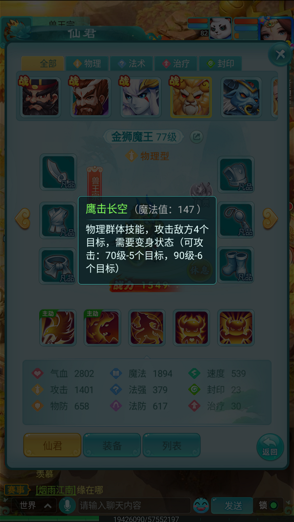 金狮魔王的核心特色在于进入战斗后会立刻展现兽王真身,进入变身状态。这不仅是发动诸多强力技能的先决条件,更能在此状态下直接提升其5%的物理伤害,令其锋芒更盛。 他的主要输出手段,便是兽王宗的招牌绝学——鹰击长空。这是一个强力的物理群体技能,能随机对敌方多个目标造成大量伤害。随着角色等级提升至70级和90级,其攻击目标数量还会进一步增加,清场能力极为出众。 作为一名纯粹的物理输出型仙君,金狮魔王的技能设计几乎全部围绕着“极致破坏力”展开。只要将他带在身边,你便能感受到何为真正的暴力推进,前路上的诸多阻碍,都将在这位狮王的怒吼与利斧之下灰飞烟灭。 |