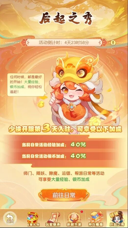 2026年新春到来之际,正是《逍遥情缘》手游与经典IP大话西游电影联动的隆重时刻!为了满足广大玩家们的游戏需求,《逍遥情缘》手游将于2月10日开放一个全新联动大服“二零二六”!不仅能重温经典IP的动人爱情故事,还有联动服专属的特色开服活动在等着你。要我说,这绝对是加入逍遥世界成为一份子的最佳时刻,还在犹豫什么?快呼朋唤友,一起进入奇妙的逍遥世界吧。 新服名称:二零二六 开服时间:2月10日10:00 【联动服专属 新服有福利】 神兵赐福 活动时间:开服第1-14天 活动规则: (1)完成神兵任务可领取道具奖励并激活对应等级的神兵赐福; (2)激活神兵赐福后打造指定等级、部位的装备,若未打造出珍品或极品,将返还一定数量的锻造石碎片,每2个锻造石碎片可合成1个锻造石; (3)每个神兵赐福激活后存在有效期,打造出珍品或极品装备或有效期到期后,神兵赐福将失效; (4)活动结束后,还在有效期内的赐福将继续生效,未领取的道具奖励将通过邮件补发(不会激活对应的神兵赐福)。 老玩家继承 活动时间:服务器开启后持续14天 开启条件:活动仅以往服务器存在历史角色的老玩家可参与,历史角色判定具体以游戏生效为准 活动规则: (1)新服达到30级的角色可领取时装、坐骑继承券; (2)同一个账号下,该服一个角色领取后,其他角色不可再领取; (3)使用时装、坐骑继承券,可继承老服40级以上历史角色的时装、坐骑,每一种类型的外观仅可选择1个继承; (4)每一种类型新服未拥有的永久外观可以被继承,部分赛事等特殊外观不可继承,继承范围请以游戏内实际显示为准。继承后历史角色的外观不受影响,坐骑继承后默认为1阶段; (5)每个历史角色每种外观类型仅可被继承一次,新服角色继承后,该历史角色将无法再被继承。 后起之秀 活动时间:角色首次登录后持续5天参与条件:服务器开启后第2至7天内首次登录的玩家 活动规则: (1)活动期间内将根据服务器开启后首次登录的天数,获得一定量的经验、银币加成; (2)参与师门、降妖、除魔、运镖、帮派日常、蜃龙迷境、十二生肖、九曜星官、北斗星君、千年妖王、普通副本、精英副本可享受对应的经验、银币加成。 特殊宠物 活动时间:开服第1-20天 活动规则: (1)活动期间内可领养小唐三藏,领养后可永久使用并培养进阶为唐三藏; (2)完成培养手册任务可获得培养积分与道具奖励,培养任务每日0点刷新; (3)累计培养积分可解锁节点奖励,活动结束后未领取的任务与节点奖励将通过邮件发放。 【冲击战力榜 赢限定坐骑】 开服第7天综合战力排名前10名玩家将获得丰厚奖励,具体细则如下↓ 第1名:限定坐骑+神兽之魂*5+金币袋*5+高级兽诀*3 第2-3名:限定坐骑+神兽之魂*5+金币袋*3+高级兽诀*2 第4-10名:金币袋*8+高级兽诀*1+坐骑之灵*1 【抽全服锦鲤 大神兽降临】 开服前七天,少侠每日活跃度达到40、80、100时可分别获取一次抽奖机会,有机会抽出随机大神兽、精美周边和游戏道具等奖励!想要在旅途的开端就得到大神兽的援护吗?那就多做日常,积攒活跃度吧。 【关注公众号 领现金红包】 新服开启后,现金红包活动将会持续开启。只要你账号下角色等级达到60级,就可以在公众号领取一次现金红包,最高可以领到100元! 【快速提等级 抽华为手机】 既然开启了新服,那肯定少不了升级抽奖活动。只要你账号下角色达到60、65、70、75时都可以分别领取1、2、3、5次抽奖次数。之后再在官网活动页中进行幸运转盘抽奖,有机会抽中各种游戏道具以及精美周边,运气好的话甚至还能抽到华为P50pro手机呢! 【首充有双倍 兔兔陪伴你】 游戏中每档元宝首充都是有双倍回馈的!而且在完成第一笔充值时,还可以获得一只珍兽兔叽者。它是咱们新手开荒的优秀伙伴,有了它的相助,少侠在各类挑战中都会更加轻松。 【微信领福利 月月有礼包】 逍遥百闻遍三界,关注微信一手抓。想要了解游戏第一手更新情报,关注官方微信公众号认准可爱的瑶瑶准没错!关注公众号后不仅可以领关注礼包,每30天还可领取一次月礼包呢。 【回馈老玩家 回归有豪礼】 新服开启后,在《画江山》或《逍遥情缘》端游有角色≥60级的端游账号或满足条件端游账号所绑定的手机号登录手游就可以领取价值600元的回归大礼包!和大家一同度过的美好时光我们都历历在目,就让咱们彼此的缘分在指尖继续延续吧。 |