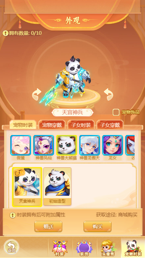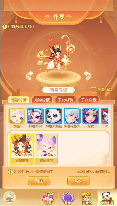 过年期间,最讲究除旧迎新,所以很多人都会买新衣服穿。既然《逍遥情缘》手游里的角色可以装扮得光彩照人,那我们心爱的宠物伙伴自然也要跟上潮流!趁着这个春节,去时装商城里给自己的爱宠挑一件好看的宠物时装换上吧! 【宠物时装 专属卖场】 和角色时装一样,宠物时装也是在“外观商城”中购买的。此外,你还可以打开宠物详情界面,在宠物模型左下角找到一个“时装”按钮,点击亦可直接跳转至商城的相关页面,操作非常便捷。 【随心预览 自由切换】 在外观商城中,你可以随时切换查看宠物穿着时装和原始造型(原皮)的效果,方便进行直观对比,满意后再决定是否购买。需要注意的是,每件宠物时装都是为特定宠物量身定制的,只能被对应的宠物穿戴,且一只宠物同一时间只能装备一件时装。 【款式多样 任你选购】 每件宠物时装除了改变外观,还能为宠物附加属性。宠物装备时装后即可获得相应加成。目前,拥有时装的宠物一共12只,如果算上孩子的话,那就更多了。快去宠物时装的卖场看一看,将你的爱宠也打扮得光彩照人吧。 |