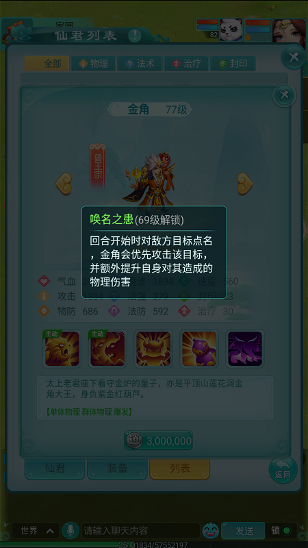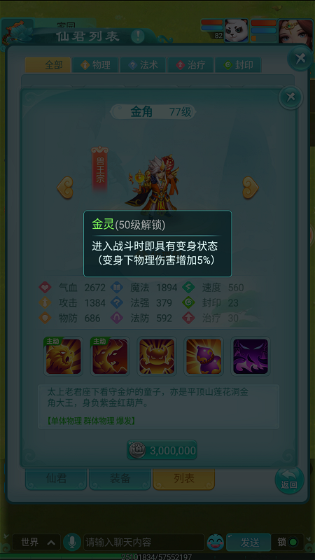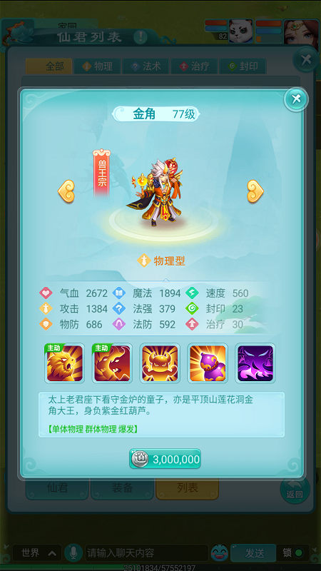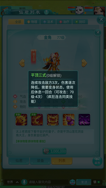 金角大王是《逍遥情缘》手游中一位实力强劲的仙君,今天我们就来深入了解一下他的本事。作为一名兽王宗的仙君,金角大王完美继承了该宗派迅捷狂野的战斗风格,其攻击力与速度均十分出色。想要邀请这位仙君加入你的队伍,需要花费300万银币。 【平顶三绝 连环重击】 金角大王的招牌绝技“平顶三式”能够对同一目标发动连续三次的物理攻击,威力十足,尽管伤害会逐次递减。此等刚猛招式自然有其限制:施展前需处于“变身”状态,且使用后需休息一回合。 【金灵护体 先发制人】 不过无需担心“变身”状态的启动问题。当金角大王达到50级,便会解锁被动技能“金灵”,使其在进入战斗的第一回合便自动处于变身状态。得益于此,金角大王能在开局就爆发出“平顶三式”的恐怖威力,打对手一个措手不及。 【唤名之患 锁定强敌】 在《西游记》原著中,金角大王曾高喊孙悟空之名,凭借法宝将其吸入。游戏中,金角大王也拥有一个与之呼应的被动技能“唤名之患”。他在回合开始时,会点名标记一名敌方单位,之后对这名被标记的敌人造成更高伤害,并优先对其进行攻击,战术针对性极强。 |