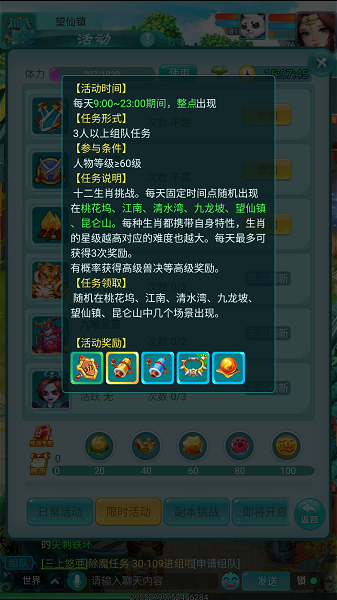 在《逍遥情缘》手游里,要说最受少侠们欢迎的常规挑战玩法,十二生肖和九曜星官绝对榜上有名。这两个玩法没有固定的入场次数限制,全靠蹲点抢怪,奖励又实打实地诱人。如果你想在游戏中挑战一下自己的能耐,便来试试吧。 【十二生肖】 每天9点到23点,每逢整点,十二生肖的怪物就会随机刷新在桃花坞、江南、清水湾、九龙坡、望仙镇和昆仑山这几张地图上。它们以十二生肖为原型,每一只都有自己独特的阵容搭配,还分为不同的星级难度。每一场战斗,都是一次全新的策略考验。 想挑战十二生肖,角色等级需要达到60级以上,并且必须组队才能发起战斗。胜利之后,高级兽诀、稀有道具都有机会收入囊中。不同生肖的机制千差万别,有的擅长爆发,有的擅长消耗,有的甚至还会互相配合——你能摸清每一只的套路和破局之法吗? 【九曜星官】 如果说十二生肖是整点的狂欢,那九曜星官就是半点的盛宴。每天9点半到23点半,每逢半点,九曜星官会随机刷新在桃花坞、长安城和望仙镇三张地图上。和生肖类似,星官也有九种不同的阵容配置,同样可以自选难度。 挑战星官需要角色等级达到65级以上,组队迎战。获胜后的奖励同样豪华,包括高级兽诀、珍稀道具等等。值得一提的是,生肖和星官的刷新时间正好错开——整点打生肖,半点蹲星官,只要队伍够硬,地图跑得勤,收获绝对少不了你的。 |