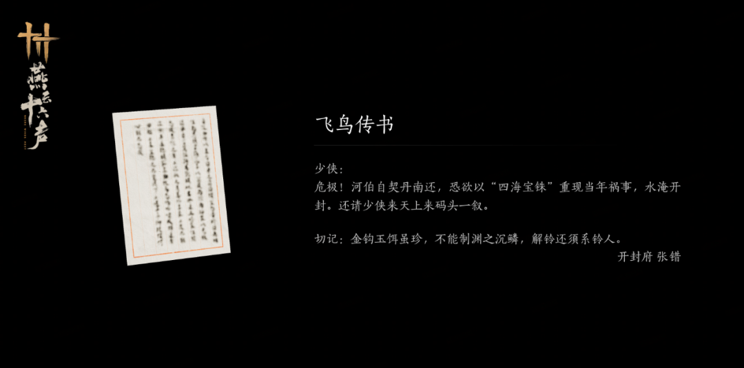 在不久前上线的1.2版本更新中,占开封近三分之一面积的「博浪沙」领域全开,开封地图已完全解锁。 “九曲黄河不渡津,四海奇珍天上来” 在开封的西北方位,“天上来渡”之处,这里曾是九曲黄河的第一渡口,也是民生攸关的江湖命脉。 宋初新朝当立,开封四处皆是暗流涌动,历经兴衰的天上来中,新的强敌挑战接踵而至。 随着一封飞鸟传书而来,江湖传说中“北投契丹”的河伯现已南还。箭在弦上,已是危极的召唤! 全新的大型镇守“天上来”开启,在杀机四伏的雨夜之中,将是一场命定归来的激战。 在镇守关卡“天上来”中,游侠们将与“线人”配合,深入渡口腹地,在风雨兼程中开启解谜和战斗。 这夜雷雨交加、风高浪急,但“风浪越大,鱼越贵”! 雨夜中,河伯的女儿红装袭来,侠女之风当仁不让。 在这“赤龙堂”的擂台之上,要想走下去,要先过她这关。 退敌之后,步步深入。在众人的惊诧中,那个男人回来了—— 手持单柄巨刃,座下龙王伴游。来势汹汹的河伯,带着一副令人望而生畏的傩面具登场。 “河伯”与座下“龙王”,将在一触即发的战斗中,带来颇具压迫感的武侠奇观。 特别需要提醒游侠们注意的是,河伯座下的“巨型锦鲤”——龙王,实力绝不容小觑。 翻江倒海中,其掀起的惊涛巨浪多不可被卸势,需要游侠们施展轻功闪躲等敏捷身手,以退为进。 而龙王汇聚水流形成的“水炮”杀伤惊人,则需要游侠们找准时机灵活应变,巧用卸势或许可以事半功倍。 在河伯极具威胁的连续进攻下,战斗将到达高潮。 在这场战斗的终局,究竟是谜题的化解,还是另一个故事的序章,还待游侠们亲自游历。 新的BOSS陆续登场,而我们对于战斗的优化还在持续进行: 专项战斗攻坚小组已于本周优化了“卸势”的体验,使其判定时间窗口更为精准,且与所选难度进行匹配。同时,游戏中的BOSS战体验优化也在持续推进,欢迎游侠们继续发来反馈和建议! 就在下周,开封城中的“黑财神”也将现身,静候游侠们挑战。 而或许还有很多初至燕云的新游侠还未到开封,但已经上线的“成长福利”活动,必须先为各位保驾护航!游侠们只需要达到相应的等级,就可以领取大量成长奖励,助力各位闯荡江湖。 最后,十六也带来了关于网易云音乐联动活动的温馨提醒: 就在明天中午12点开始!无论是PC还是移动端,只要游戏等级达到十级后,均可通过游戏内的【活动】页面跳转至网易云音乐App活动页面(转发分享无效),登录网易云音乐账号,即有机会领取网易云音乐黑胶VIP随机天数(最高180天)。数量有限,先到先得! 更多资讯,请锁定叶子猪《燕云十六声》官方合作专区。 |