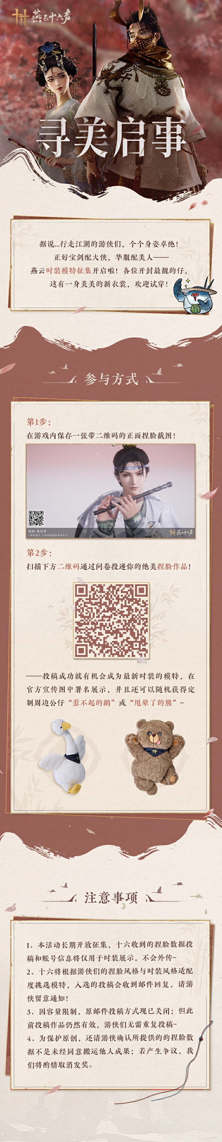 今日正逢春分时节,春生美好,万物勃发。 明日燕云将迎来1.6.5版本的更新,江湖一大盛事——首届燕云侠奥会将揭幕。 而下周,河西区域的首个篇章「玉门关」也即将开放。为了让游侠们的新旅程更为畅通,维护结束后我们将开放预下载功能。游侠们可以从游戏主界面进入,提前下载相关资源,届时与第一缕春风一起,远度玉门关。 移动端更新大小预计将在1-2G之间,PC端预期在5-10G之间,不同设备可能会有不同。每位完成预下载的游侠,我们也将有188长鸣玉薄礼奉上。 与此同时,江湖之中又有诸多新功能、新外观登场—— 行走江湖,有一件称手的兵器非常重要。虽迟但到,本次更新后,燕云将新增对移动端使用手柄操控游玩的支持。游侠可通过PS手柄、XBOX手柄的蓝牙与移动端进行连接,然后按照提示将控制设备切换为「手柄」,或者在「设置-基础设置-控制设备」选项处进行切换。 希望这个新功能可以给游侠们带来更多“称手”的选择。我们也将持续努力优化各端的易用性体验,让游侠们可以更称心如意地畅游江湖! 称手之外,风尚也很重要。在本次更新中,还有全新奇术特效即将上架! 「天龙舞火」 【神龙吐火】特效外观 世间滔滔,业火炽然。 九天之上,有龙名天。嘘气成云,怒而成火。 惊魑魅,诛魍魉,一啸可灼天下。 「龙战千山」 【太白醉月】的特效外观 龙战于野,其血玄黄,何惧耶? 真的猛士,可蹈万军, 摧其坚,夺其魁,解其体。 执金龙于绝巅之上,只道一声——何人可战。 明日更新后,将会开放新的「闻音商店」,游侠可将【八音窍】以1∶5的比例兑换为【音玉】。以上两款外观均可前往「闻音商店」,以限时特惠价2【音玉】兑换获得。42天后将恢复原价3【音玉】。 敬请注意,【音玉】为绑定道具。从「闻音商店」获得的道具均不可寄售且无法进行赠送。 江湖新篇章即将开启,我们与诸位一样兴奋。但正是如此,我们更知打好基本功,做好持续优化的重要性。本次的1.6.5版本还有诸多优化与更新,等待各位检验。 十六巷计划于2025年3月21日6:00~8:00进行停服维护更新,维护期间将暂时无法登录游戏,开服时间将根据实际情况可能提前或延后,请游侠合理安排游戏进度。 停服维护期间,游侠将暂时无法登录游戏,因此给游侠带来的不便,十六巷深表歉意!我们将在维护结束后,为游侠奉上一份歉礼,请诸位游侠在维护结束后登录游戏查收。 更多更新详情,请查看下图放大更新内容预告—— 燕云时装模特征集活动仍在继续 欢迎各位少东家积极投稿,大方展现侠士英姿 注:投稿方式现已转为问卷投稿 (此前投稿依然有效) 更多详情敬请查阅↓↓↓ -END- 更多资讯,请锁定叶子猪《燕云十六声》官方合作专区。 |