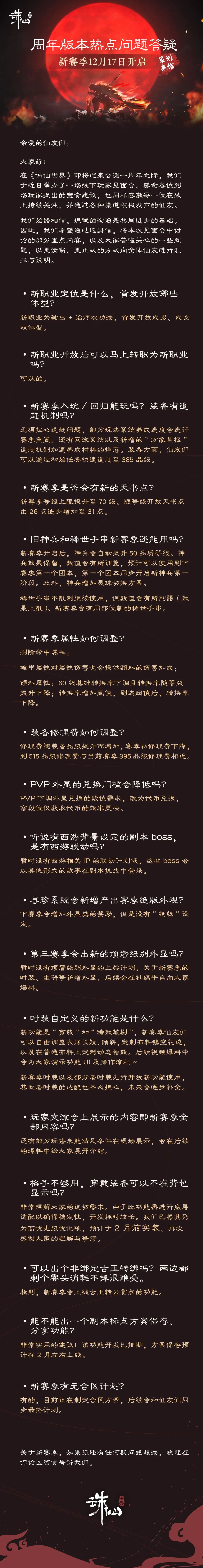 自第一封信发出以来,我们始终密切关注着来自各平台的仙友们的声音与反馈。 本次我们集中整理并回答了近期大家频繁问及的一些热点问题,希望能解答一部分仙友关于新赛季的疑惑。 我们始终相信,真诚的交流,是我们一路同行、共同成长的根本。 关于新赛季,大家如有任何疑问及想法,也欢迎在评论区继续留言给咱~ |