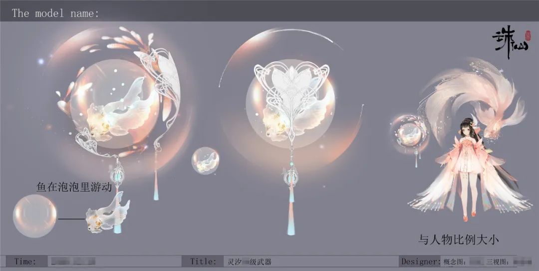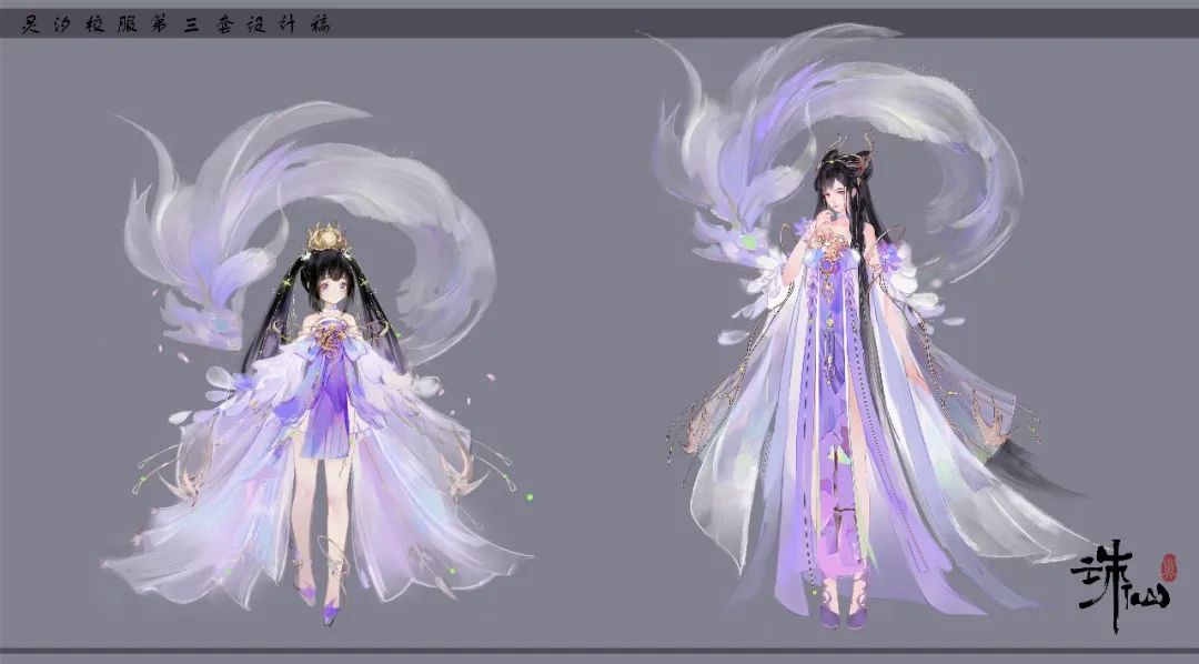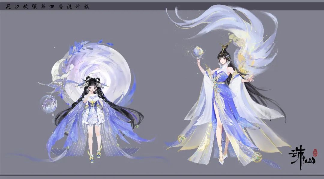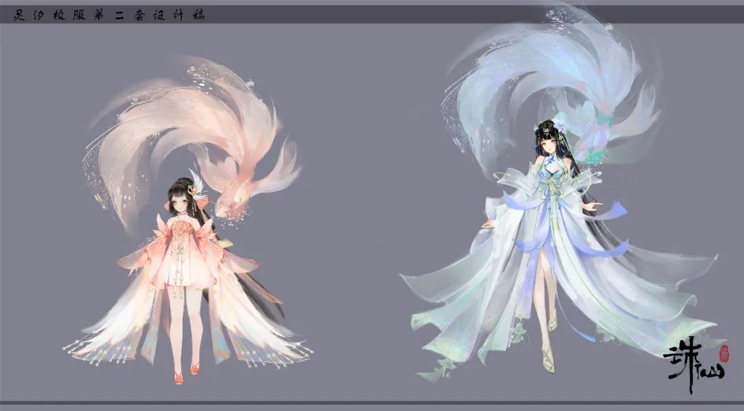 仙长们好,欢迎回到研发幕后故事栏目「仙长,请过目!」 今天来汇报的又双叕是你们的小书童,小瞳(●′?`●)? 终于又见到你们啦! 这一期我们请到了剧情策划:阿良的隔壁,主美:阿良,以及角色美术:艾司,和大家一起聊聊灵汐是如何诞生的。 小瞳:欢迎老师们~ 阿良的隔壁:仙长们好久不见哈~ 阿良:大家好,很高兴又能见面。 艾司:大家好大家好,上次聊完帅帅的焚香,这次来聊聊灵汐小可爱! 小瞳:那我们就直接进入正题咯~ - 天地化灵,滋养万物 - 小瞳:各位老师,灵汐作为原创角色,和诛仙世界的关系是怎么样的呢? 阿良的隔壁:《诛仙世界》顾名思义,是诛仙的延伸。我们在做世界观设定的时候,以《诛仙》原著故事为核心,延伸补全了这个世界的完整蓝图。也就是说,《诛仙》的故事,是在这个世界中的一部分。 在小说描述的视角以外,这个世界也在运转,它也有漫长的历史,有错综庞杂的关系网络。我们希望《诛仙世界》里不仅仅有《诛仙》,我们更希望它是一个庞大而生动的世界,诛仙世界源于诛仙,但不止于诛仙。 灵汐在诛仙世界中,是一个历史非常悠久,且与世界命运紧密结合的族群。他们是天地阴阳之气形成的水灵,每个灵汐弟子的降世都遵循自然规律,是冥冥中早已注定的。 灵汐的水灵之身蕴含疗愈、净化众生的独特力量,故而在诸多重大事件中占据重要地位,与众多门派皆有来往。 小瞳:作为游戏里的原创职业,咱们是如何给灵汐进行设定的呢? 阿良的隔壁:灵汐这个职业的诞生,其实是我们在丰富诛仙世界的过程中慢慢确定下来的。诛仙故事发生在仙侠世界里,万物有灵,修仙者更是有驾驭天材地宝的能力。 在我们熟悉的世界里,生物是在漫长的物质变化中形成的。那么在仙侠世界中,天地汇聚的灵气,也应该能通过某种机缘或者衍化,形成生命体。 我们思考这样的生命应当以哪种形式表现,在经过讨论后,我们决定借用道家思想中的“天地相合,以降甘露”,天地之气交汇时,气聚集成云,降而为雨,水从云中生。 所以灵汐是作为水灵之体诞生的,身形不受年岁制约,可以自由生长。而水性至阴至柔,所以灵汐阁弟子都是女子。 作为水灵之身的灵汐,性情温柔,积极。水利万物,滋养着众生,所以灵汐有治愈、净化之力。水中最常见的生灵便是鱼,灵汐转化力量的一种方式,是通过凝聚灵力召唤灵鱼。 灵汐武器原画 所以,灵汐的双元素是“水”与“鱼”,代表着灵汐本身和能驾驭的力量。 小瞳:那么,艾司老师,灵汐的外形是怎么被设计出来的呢? 艾司:我们给灵汐做角色,也遵循先定气质的流程。作为清新疗愈的女性门派,我们为灵汐确定的气质是温柔、活泼的仙女。与其他门派稍有不同的是,灵汐在成女体型和稚女体型的气质上有一点区别。成女灵汐更加温婉、清纯,稚女更加天真,可爱。 灵汐是我们第一个稚女体型,我们希望她是可爱的,但又不仅仅是可爱。作为水灵化身,她的年龄其实并不小,所以我们不希望她是低幼化的,她的可爱里应该带着仙气、灵气。以水为元素,也需要有一些天真、清澈的感觉在里面。 在稚女体型的身材比例方面,我们考虑过许多方案。十四五岁的少女与成女在气质上区分会比较小,在表现可爱上稍显不足,更贴近清纯,被我们否掉了。五六岁的小女孩矮矮的非常可爱,但是与咱们游戏里成男、成女的体型不太搭配,显得脑袋太大,又不太满足小仙女的感受。 后来,我们根据成男、成女头部的大小,略微缩小,作为稚女的头部,再去找符合比例的身材,确定在了八九岁的小女孩外形上。这样的身材比例天真可爱,也与其他体型更加契合。 灵汐校服原画 小瞳:校服的设计上,稚女与成女也有区别吗? 艾司:是的,其他门派男女校服在款式类似的情况下,也很容易做出区分度。但灵汐同为女性,想要有一致性的情况下又做出区分,是有一点难度的。 在校服设计的过程中,我们先做了稚女体型,再根据稚女体型设计成女的服装。因为成女校服的气质,放在小女孩身上,会容易呈现过度成熟的感受。即使经过修改,也还是没办法体现出小女孩的可爱与活力。反而是先设计稚女体型,再改为成女,会让成女校服更加清纯,灵气。 但无论是成女还是稚女,我们都希望把水和鱼的感受与灵汐的服饰结合,所以整体颜色比较浅,比较柔和。 为了表现鱼的元素,我们给稚女灵汐采用了蓬蓬裙搭配长飘带,袖子采用通透的薄纱配合一些纹理脉络,模拟鱼尾的感受。在飘带、袖子的布料上,我们用了很多渐变色,这样看起来更像鱼的颜色,也能带来水一般的通透感和流动感。 灵汐校服原画 短款的蓬蓬裙显得比较活泼,符合稚女的感觉,类似鱼尾的飘带和大廓型水袖,能够增加灵动的气质,一长一短配合,就能塑造出又可爱又仙气的小灵汐啦~ 成女灵汐在配色和材质上与稚女类似,但是在款式上有一些区分,因为成女与稚女的身材比例不同,采用相同设计会有些违和。成女采用的是拖地轻纱裙的设计,比起稚女会更加温柔婉约。除了裙摆长短以外,袖子和衣领的设计也不太一样,成女的身材比例会修长一些,所以我们做的时候会更凸显腰线和肩颈。 灵汐校服原画 部分成女和稚女校服的颜色也有区别,灵汐都是水灵化形,被天地孕育,她们遇事很团结,但也是自由灵动的,像凝聚成流的水,也像海里色彩斑斓的鱼, 如果只有一种颜色去表达,会显得有点单调。而且,有些颜色在稚女身上天真可爱,但