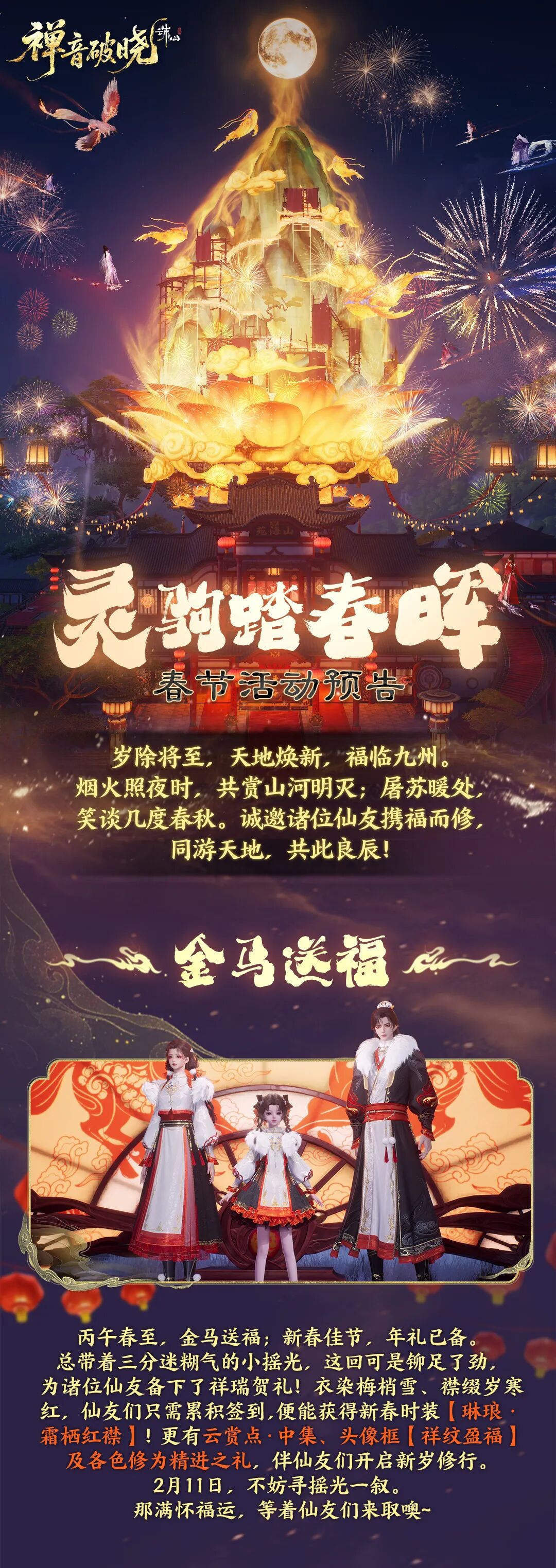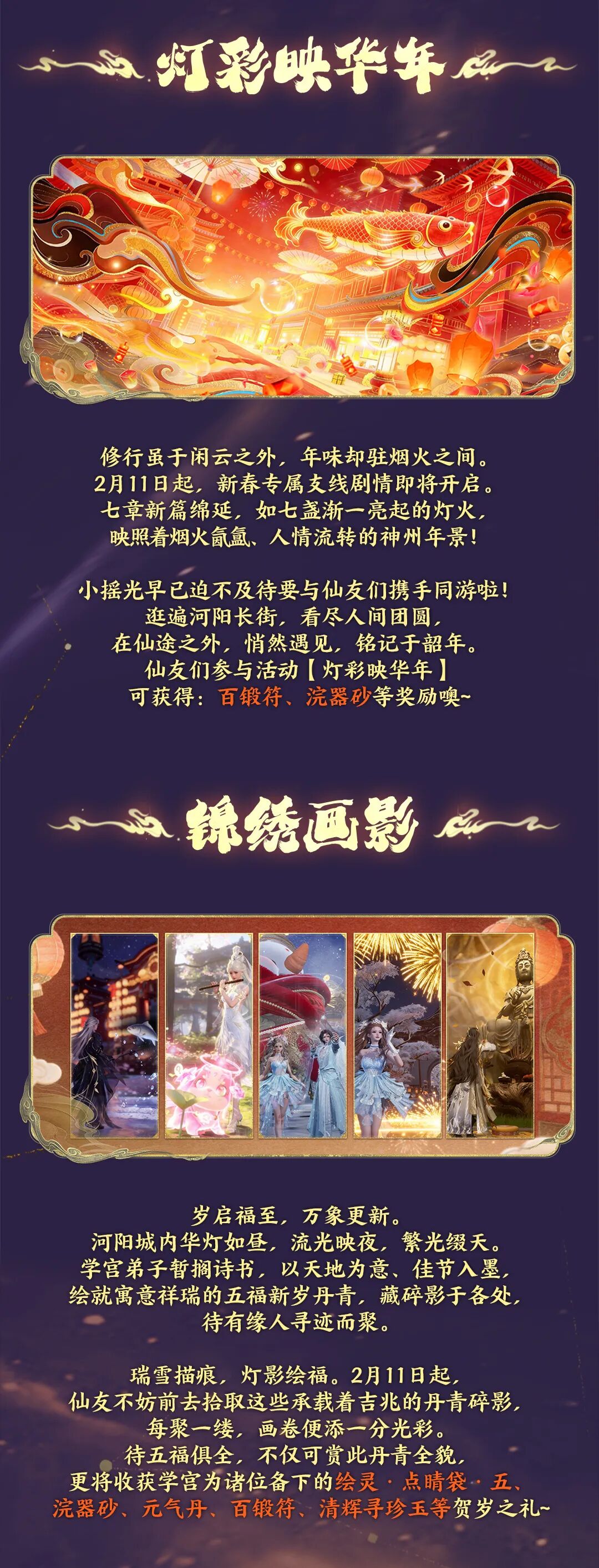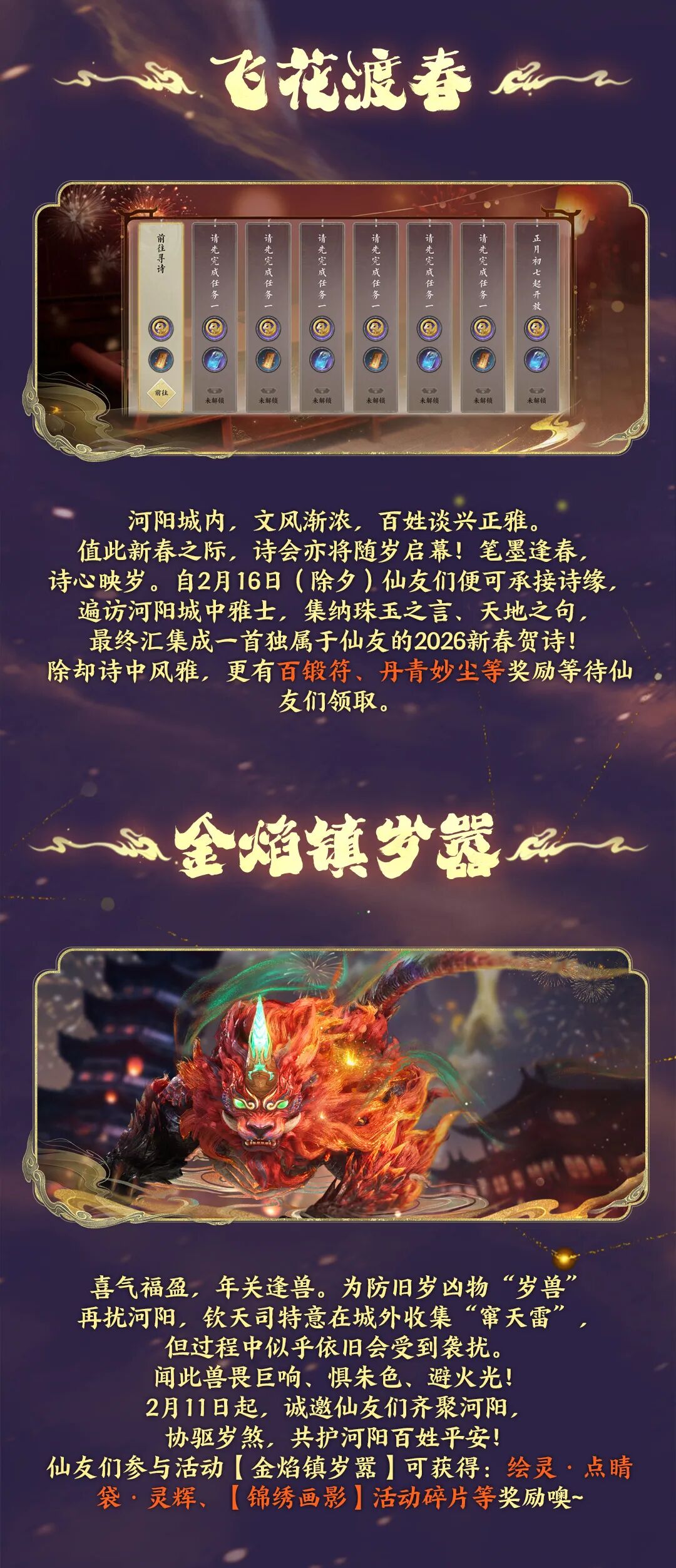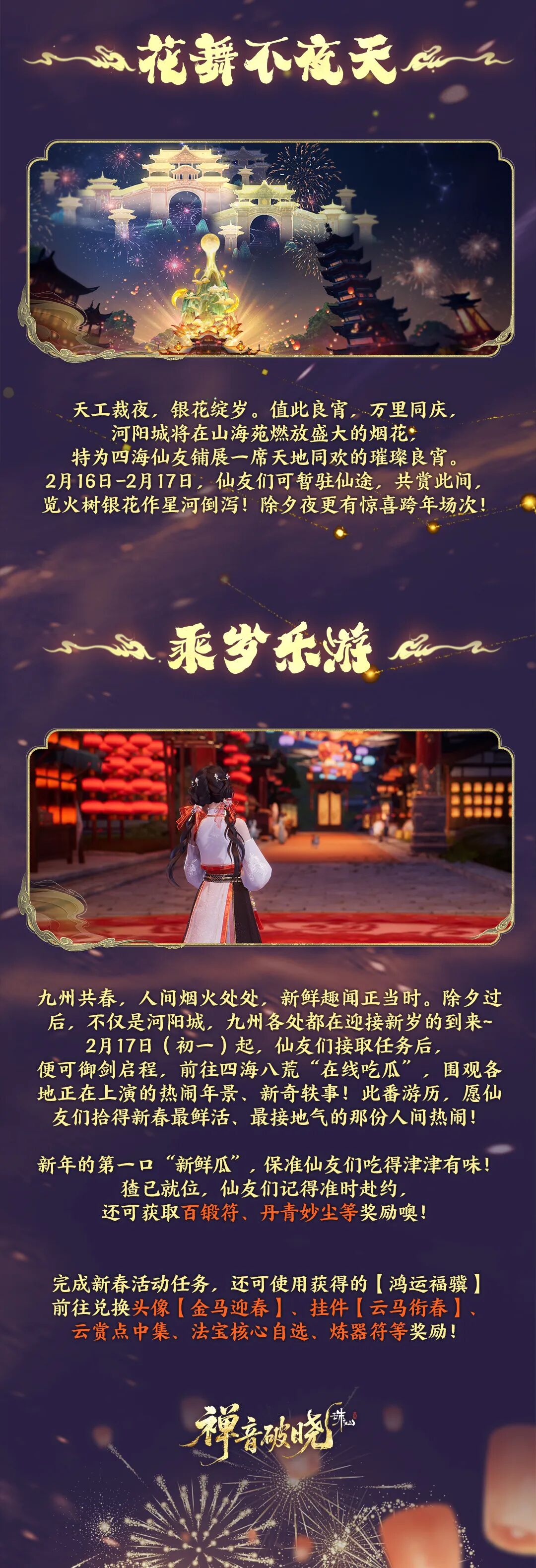 又见新桃换旧符,再逢岁暮近春声。这是仙妹和仙友们共度的第二个新春啦! 修行在朝暮,年味在此时,老祖宗传下来的那些热闹与讲究,咱们一桩也不能少! 从前祭祖祈丰、驱邪纳福,如今咱河阳城内有长街灯市如昼、烟火绘天作画、诗笺妙若飞花。 就连《沪壖话旧录》里那只总想捣乱的年兽,也又在城外探头探脑了呢! 新春在即,天音门派师兄也带来了新春祝福噢! |