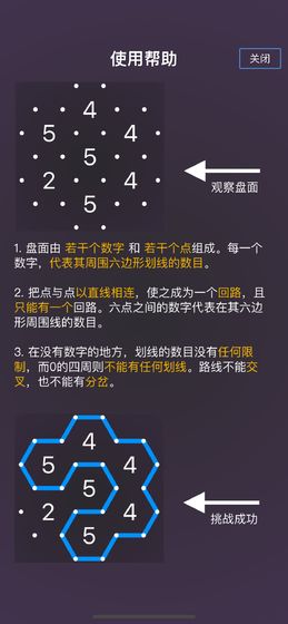 2. 把点与点以直线相连,使之成为一个回路,且只能有一个回路。六点之间的数字代表在其六边形周围线的数目。